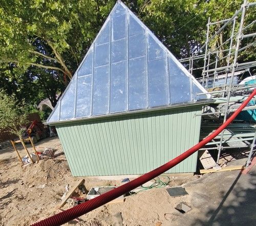 Donc en juin 2025 une entreprise a déposé la toiture existante, puis l'a rehaussée en la couvrant de tôles en bacs métalliques. Photos prises en juin 2025 pendant et après les travaux.