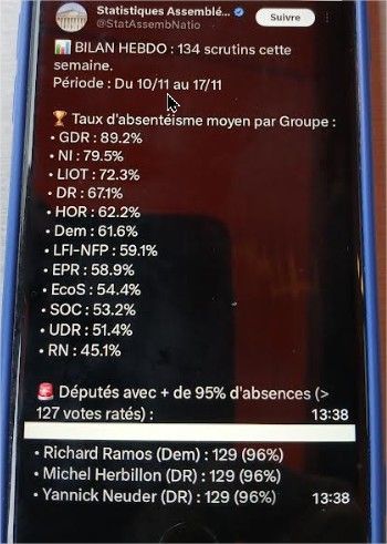 La note de l'Assemblée nationale, ci-dessous, nous apprend l'assiduité de notre député. Assiduité, nulle ! Tout employé, avec un tel taux d'abstentéisme serait viré immédiatement sans indemnité. Lui, non ! Il parade avec morgue... et avec notre argent. Est-il feignant ? Est-il fainéant ? À vous de le dire…